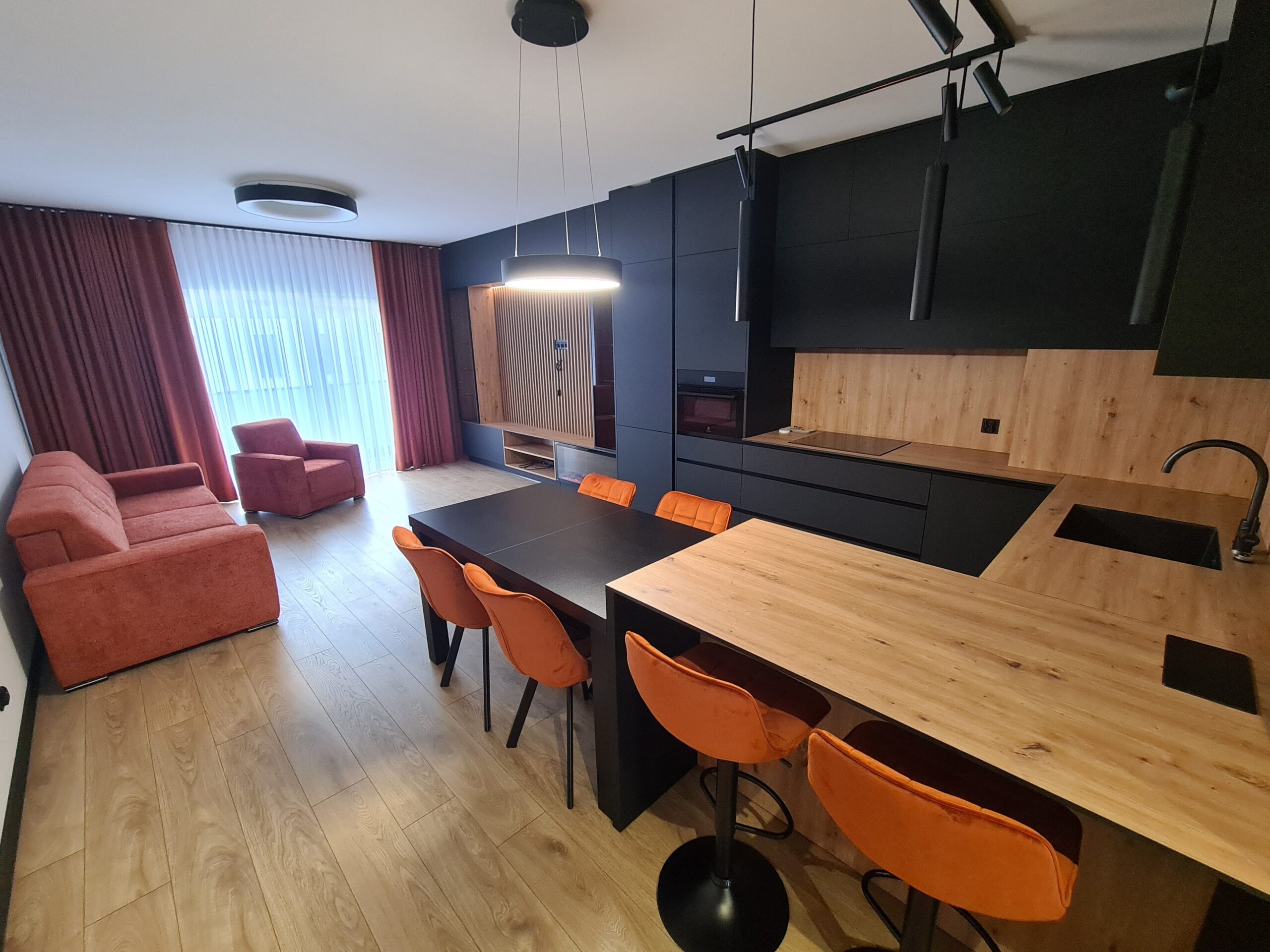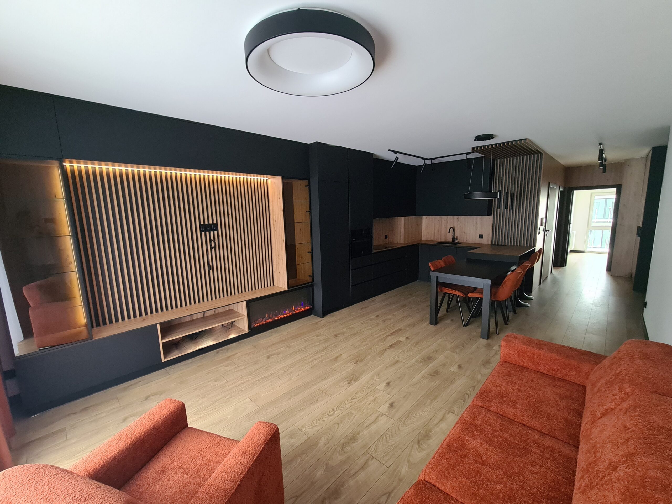 – pokój dzienny ( sofa, fotel, stół, krzesła, hokery) z aneksem (lodówka SAMSUNG, płyta indukcyjna , piekarnik z mikrofalą i funkcją pizza, zmywarka, okap – ELECTROLUX) (28,93 m2) z wyjściem na balkon (5,65 m2),