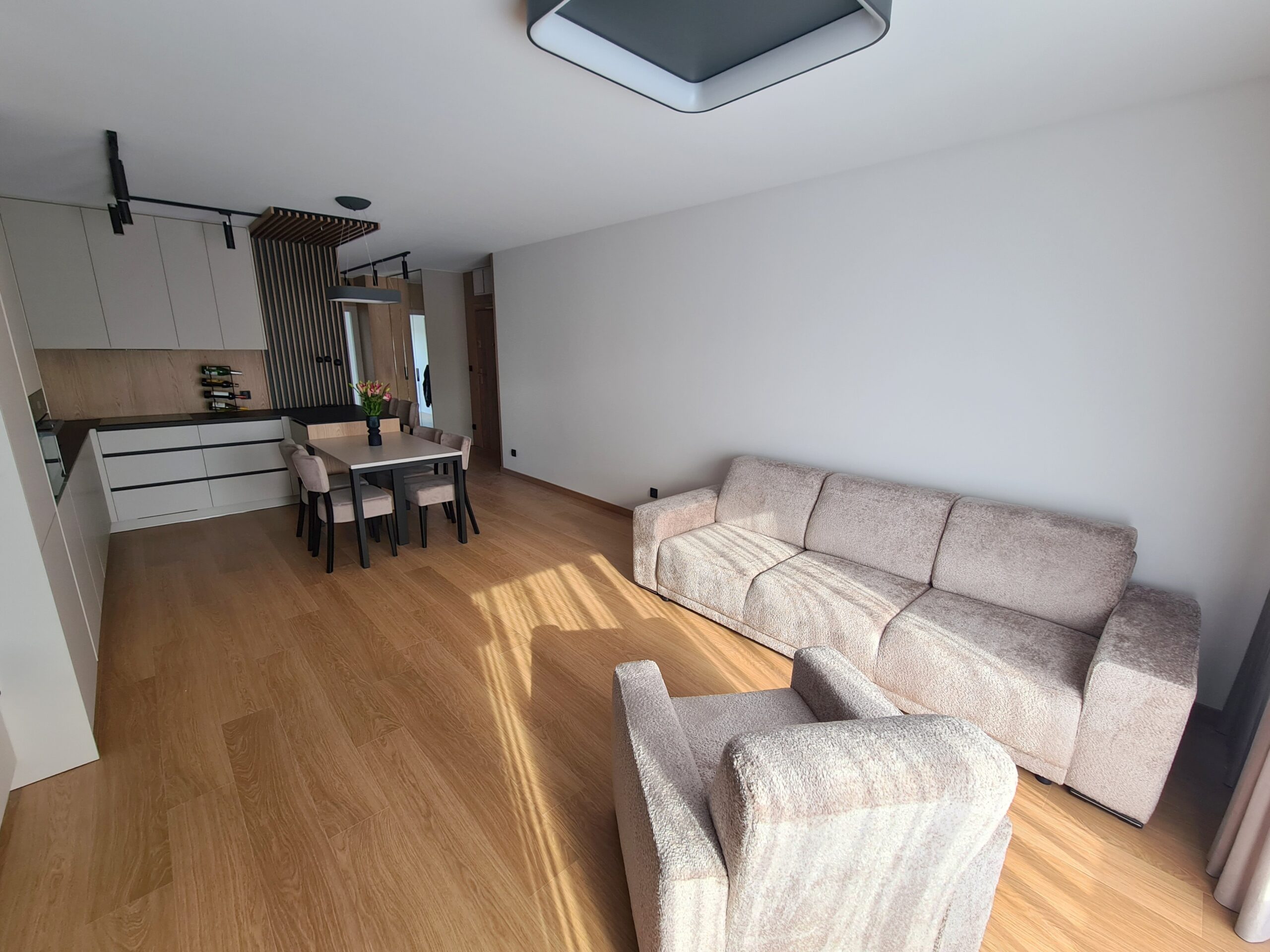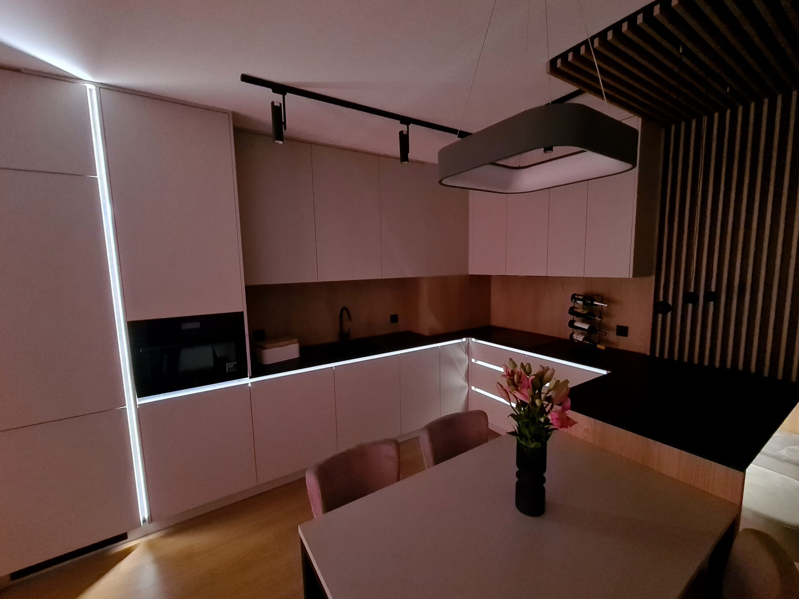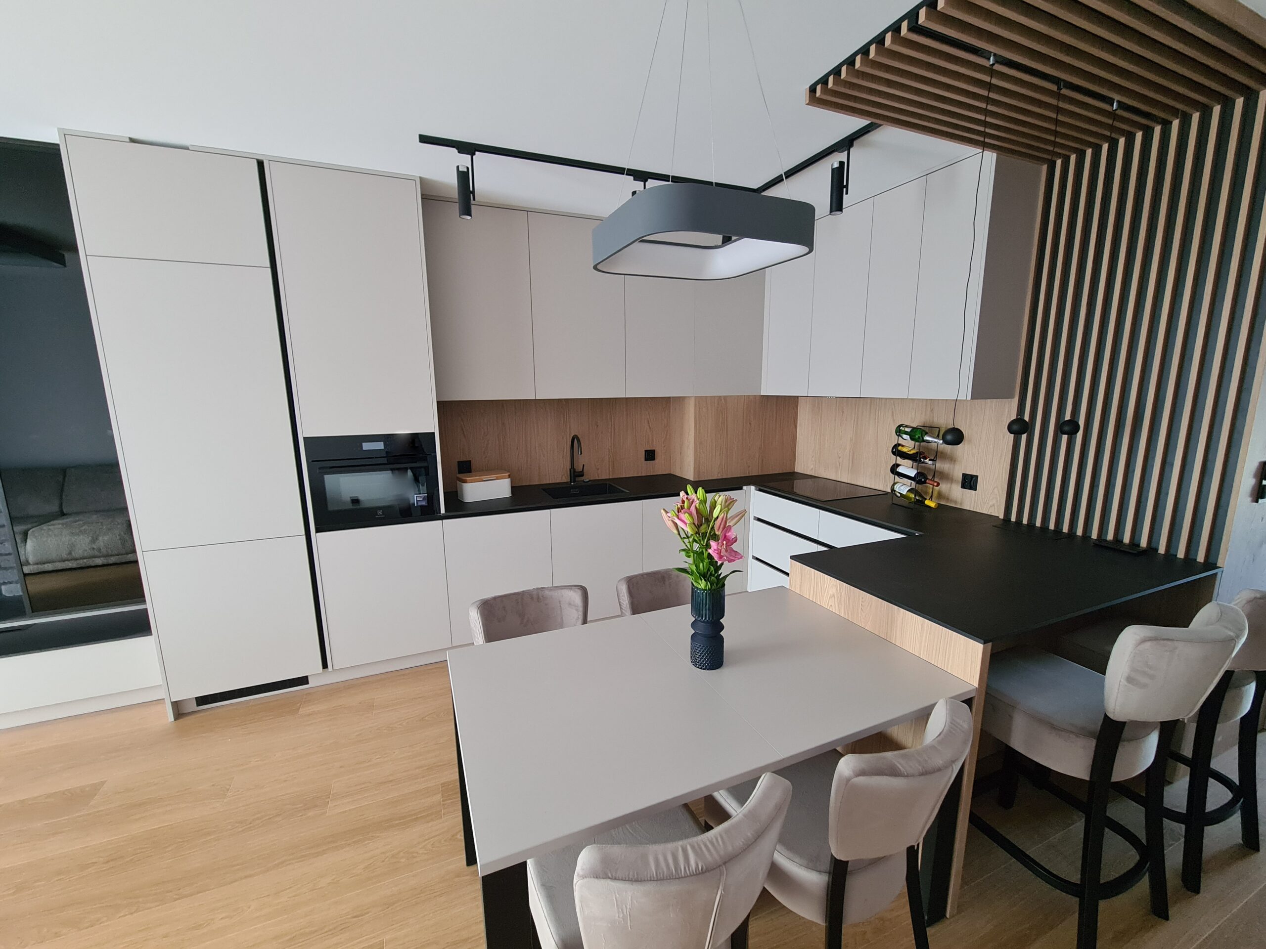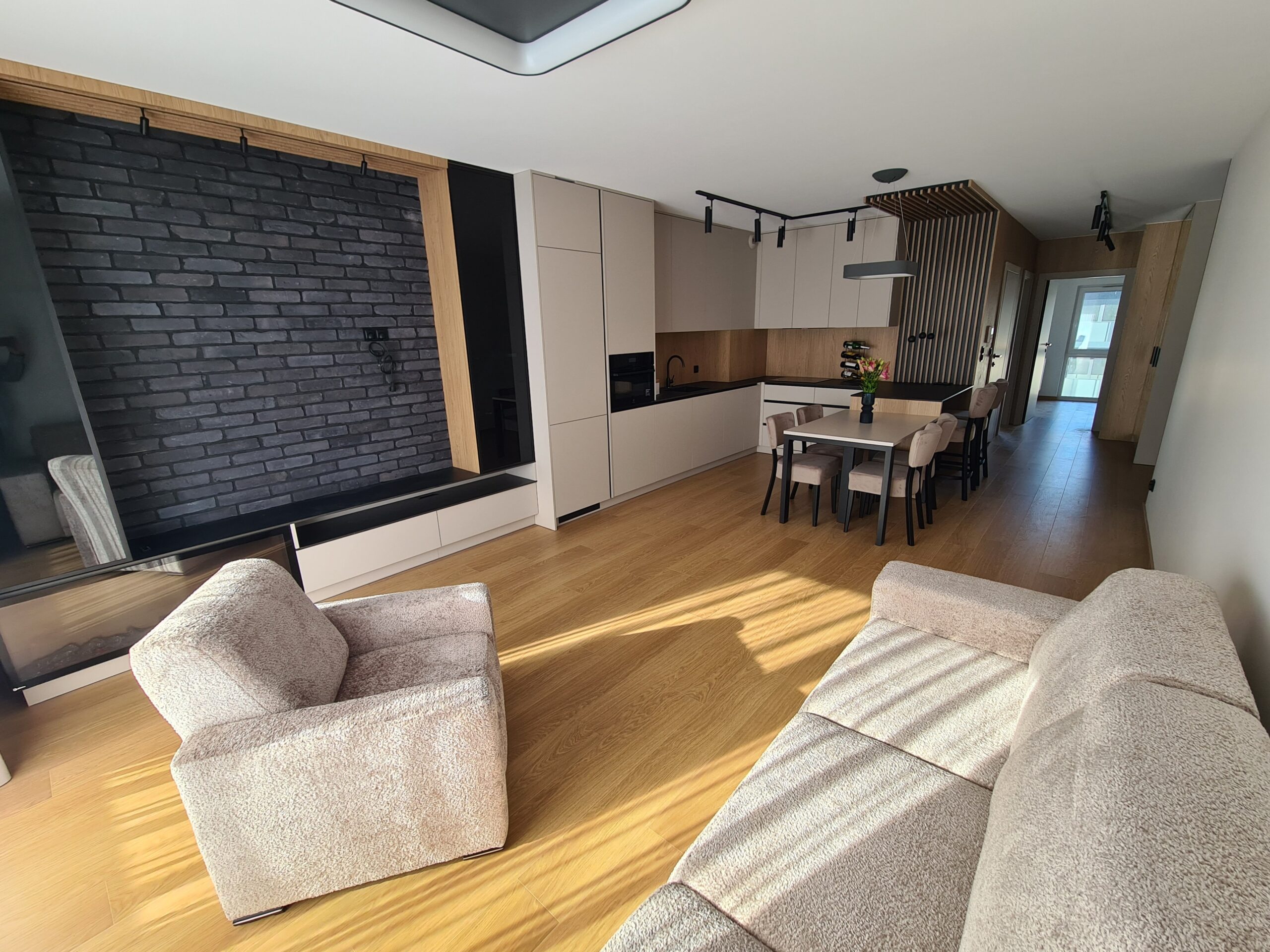 – pokój dzienny ( sofa, fotel, stół, krzesła) z aneksem (lodówka SAMSUNG, płyta indukcyjna , piekarnik z mikrofalą i funkcją pizza, zmywarka, okap ) (28,90 m2) z wyjściem na balkon (5,76 m2),